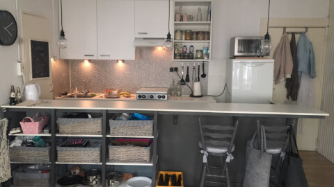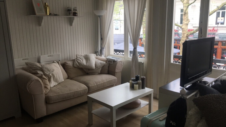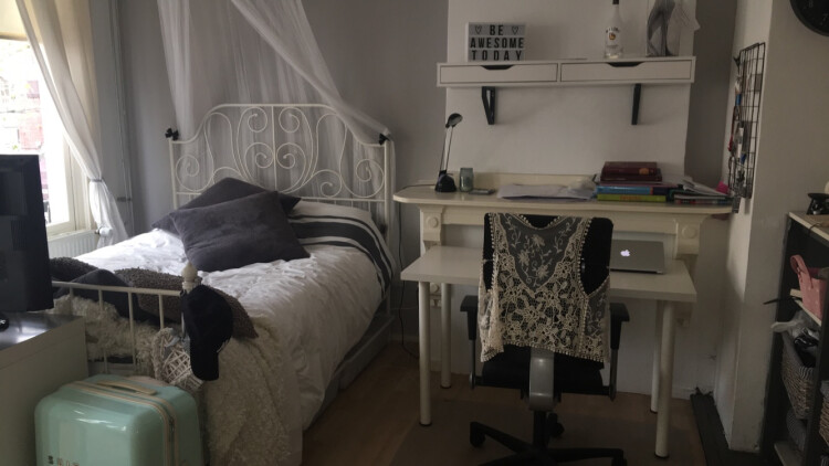 Kamer met grote twijfelaar, bank, tv, bureau met stoel, keuken, vaatwasser, wasmachine, diepvries en koelkast, servies, glazen, oven, magnetron, fornuis met 4 pitjes, douche, wasbak en veel opbergruimte. Mogelijkheid tot wifi, tv en fietsplek in de gang. Toilet op de gang, delen met vrouwelijk huisgenootje.