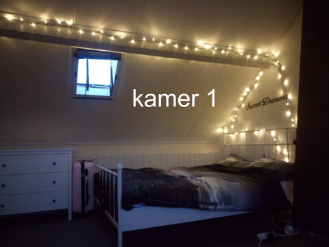Zolderkamer van ongeveer 25m2 met veel lichtinval, wasbak, koelkast, veel opbergruimte en verder geheel gemeubileerd (zie foto’s)
